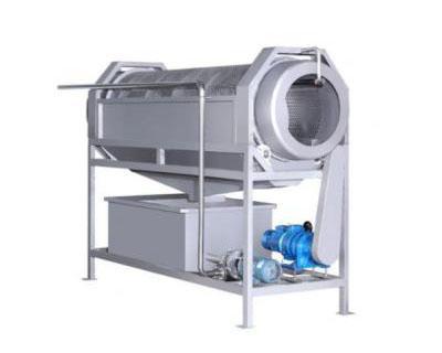 單機(jī)由機(jī)架、傳動(dòng)電機(jī)、傳動(dòng)罩殼、滾筒、噴淋管、集水槽、高壓噴嘴等部件組成。其中滾筒為其主要結(jié)構(gòu),與水平呈3°~5°傾斜角放置,工作時(shí)由減速機(jī)驅(qū)動(dòng)滾筒轉(zhuǎn)動(dòng)。果蔬原料通過(guò)輸送機(jī)均勻地進(jìn)入滾筒,滾筒內(nèi)有不銹鋼管條形排列成圓形,在滾筒內(nèi)部設(shè)有四個(gè)階梯制成的多角形,由于滾筒的轉(zhuǎn)動(dòng)使物料不斷地翻轉(zhuǎn),物料與滾筒表面以及物料與物料表面相互產(chǎn)生摩擦,在滾筒上方安裝了高壓噴淋管,物料翻轉(zhuǎn)的同時(shí)噴淋管噴射高壓水沖洗物料表面,使物料在整個(gè)翻轉(zhuǎn)移動(dòng)的過(guò)程中都能受到充分的沖洗。沖洗出的污水由集水槽收集后排出。物料在清洗過(guò)程中,由于滾筒的傾斜,受重力作用從高向低處緩慢移動(dòng), 后從出料口排出。