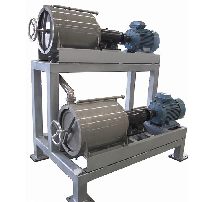 去殼打漿機作業原理:物料進入篩筒后,由棍棒的回轉效果和造紙機械導程角的存在,使物料沿著圓筒向出口端移動,軌跡為一條螺旋線,物料在刮板和篩筒之間的移動過程中受離心力效果而被擦破。汁液和肉質(已成漿狀,從篩孔中通過收集器送到槽式打漿機下一工序,皮和籽從圓筒另一開口端排出,抵達分別。