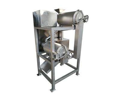 DJ型打漿機:電機采用皮帶驅動,使安裝在花鍵上的轉子部件高速旋轉。水果從進料口進入機器,飼料漿刀片將原料螺旋送至打漿棒。在打漿棒的作用下,材料被搗碎。由于離心力的存在,原料中的果汁和肉類(已呈紙漿狀)通過篩孔進入下打漿(篩孔取決于果核的大小),渣漿葉片將果核從渣口排出,從而實現果肉和礦渣的自動分離。