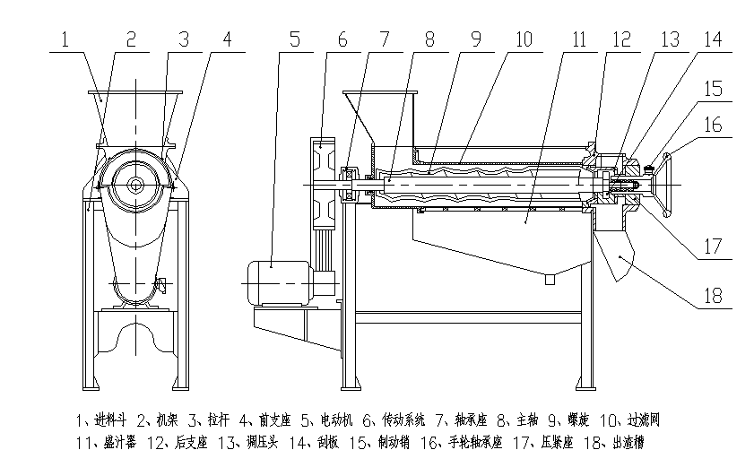 ★ 由前支座、進(jìn)料斗、螺旋、過濾網(wǎng)、盛汁器、后支座、出渣槽等組成,螺旋主軸左端支撐于滾動(dòng)軸承座內(nèi),右端支撐于手輪軸承座內(nèi),電機(jī)通過一對(duì)三角皮帶驅(qū)動(dòng)螺旋進(jìn)行工作。